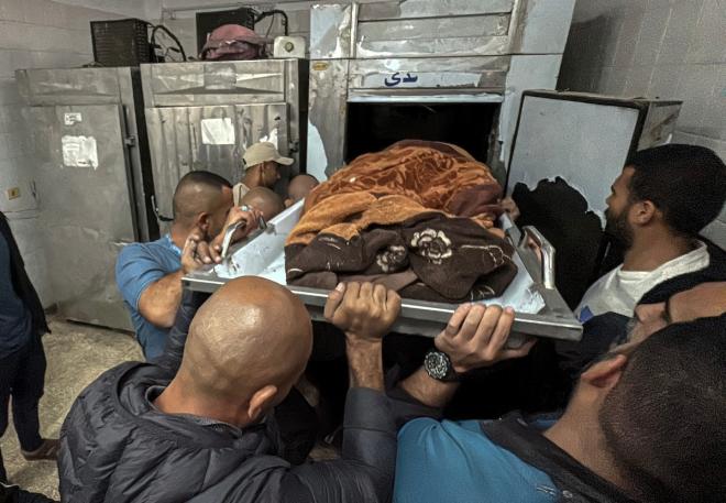 فلسطينيون ينقلون الشهداء والجرحى إلى مستشفى شهداء الأقصى بعد أن استهدفت الغارات الإسرائيلية منازل متفرقة في دير البلح وسط قطاع غزة في 22 نوفمبر 2025. تصوير: أحمد إبراهيم