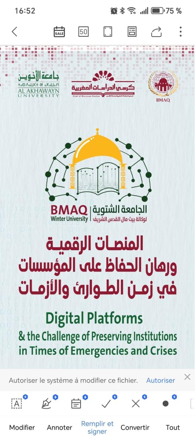 تنظم وكالة بيت مال القدس الشريف جامعتها الشتوية برسم سنة 2025 ، غدا الإثنين بإفران، في موضوع: "المنصات الرقمية ورهان الحفاظ على المؤسسات في زمن الطوارئ والأزمات"، بمشاركة طلاب فلسطينيين من القدس وغزة، إلى جانب طلاب مغاربة من جامعة الأخوين والمدرسة الوطنية للهندسة المعمارية بفاس.