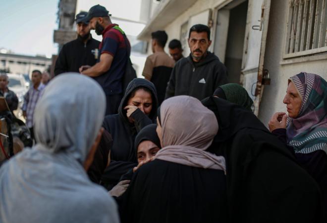 أقارب الفلسطينيين الذين فقدوا أرواحهم جراء الهجمات الإسرائيلية، ينعون خلال مراسم الجنازة التي أُقيمت في مستشفى الشفاء بمدينة غزة، في 23 نوفمبر/تشرين الثاني 2025.