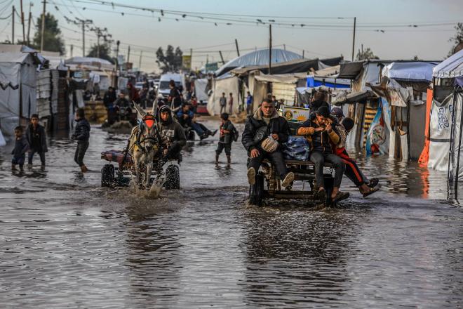 وفي مشاهد أخرى من منطقة العطّار بالمواصي، اضطر المواطنون لاستخدام عربات تجرها الحمير لعبور الشوارع الغارقة بالمياه، وتحمل البرد القارس والأمطار الغزيرة التي تغمر خيامهم، في مشهد يلخص تقاطع الفقر والنزوح وسوء البنية التحتية مع قسوة الطقس.