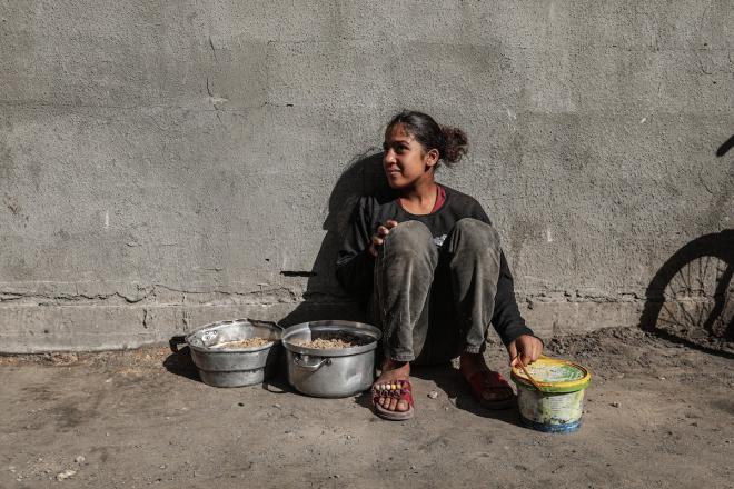 فلسطينيون في مخيم النصيرات وسط قطاع غزة يتلقون وجبات ساخنة من جمعية خيرية للنازحين جراء الهجمات الإسرائيلية، بينما يتجمع حشد كبير من النساء والأطفال أثناء التوزيع، في 30 نوفمبر/تشرين الثاني 2025.