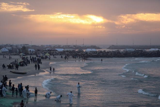 يقضي فلسطينيون نازحون وقتًا على الشاطئ مقابل خيامهم الممتدة على طول ميناء غزة، في غزة، 5 ديسمبر/كانون الأول 2025.