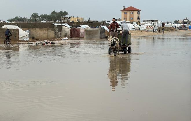 يُعاني الفلسطينيون من الفيضانات التي أعقبت هطول أمطار غزيرة على دير البلح وسط قطاع غزة، في 12 ديسمبر/كانون الأول 2025.