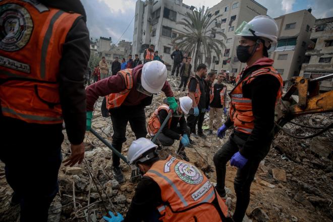 عمال الدفاع المدني الفلسطيني يبحثون عن جثث في مبنى منهار يعود لعائلة سالم، استُهدف بغارات إسرائيلية في بداية الحرب، في شارع الجلاء بمدينة غزة، يوم الاثنين 15 ديسمبر/كانون الأول 2025. صور : عمر أشتوي