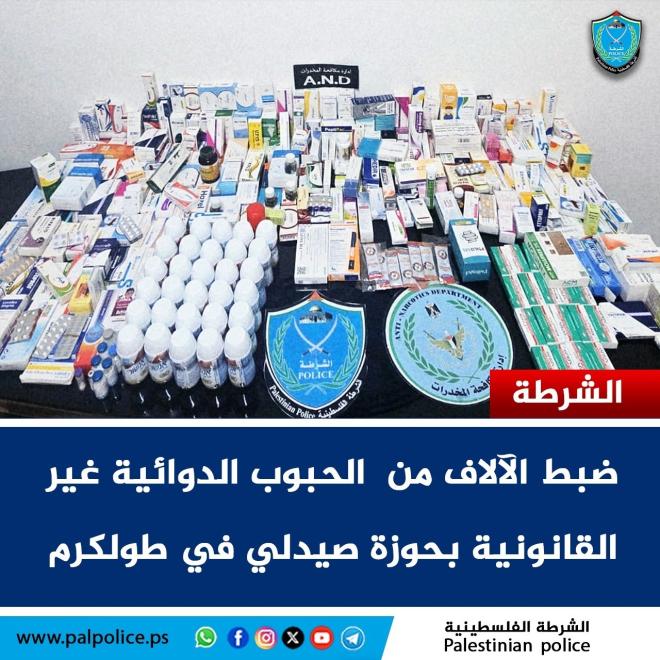 ضبطت شرطة مكافحة المخدرات، يوم الثلاثاء 16ديسمبر/كانون الأول 2025، وبإسناد من مركز شرطة عنبتا، كميات كبيرة من الأدوية غير القانونية بحوزة أحد الصيادلة في محافظة طولكرم، في إطار جهودها المستمرة لحماية صحة وسلامة المواطنين.