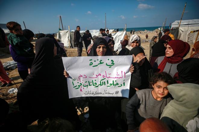 نظّم نازحون فلسطينيون وقفة احتجاجية في مدينة غزة، مطالبين بتسريع جهود إعادة الإعمار وإدخال بيوت متنقلة بدلاً من الخيام، التي لا تصلح للسكن في ظلّ موجة المنخفض الجوي التي تؤثر على قطاع غزة.