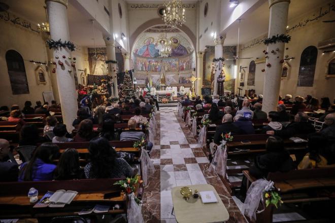 مسيحيون فلسطينيون يحضرون قداس عيد الميلاد في الدير اللاتيني بمدينة غزة في 24 ديسمبر/كانون الأول 2025. صورة: عمر أشتوي
