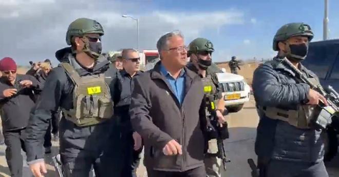 وقالت الشرطة في بيان، مساء اليوم ، إن المتطرّف "إيتمار بن غفير زار  قرية ترابين البدوية في النقب والمفوض العام للشرطة داني ليفي، (حيث التقى) القوات العاملة في بلدة الترابين".