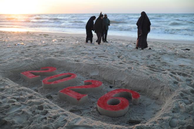 لا يزال الفلسطينيون يأملون في وقف دائم لإطلاق النار، وقد كتبوا الرقم "2026" على رمال شاطئ مدينة غزة مع غروب شمس آخر يوم من عام 2025 وحلول أول ليلة من العام الجديد.