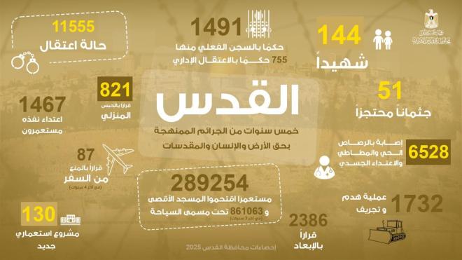 أصدرت محافظة القدس تقريرها حول جرائم الاحتلال الإسرائيلي في محافظة القدس خلال الخمس سنوات الماضية، حيث أوضح التقرير الانتهاكات الإسرائيلية في المحافظة والذي كشف حقيقة جرائم الاحتلال الإسرائيلي خلال الأعوام من 2021 ولغاية 2025، في مناحي الحياة كافة.