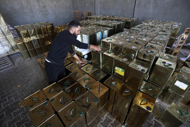 عمال فلسطينيون يجهزون صفائح زيت الزيتون لتصديرها لدول الخليج في مدينة خان يونس جنوب قطاع غزة 10.jpg