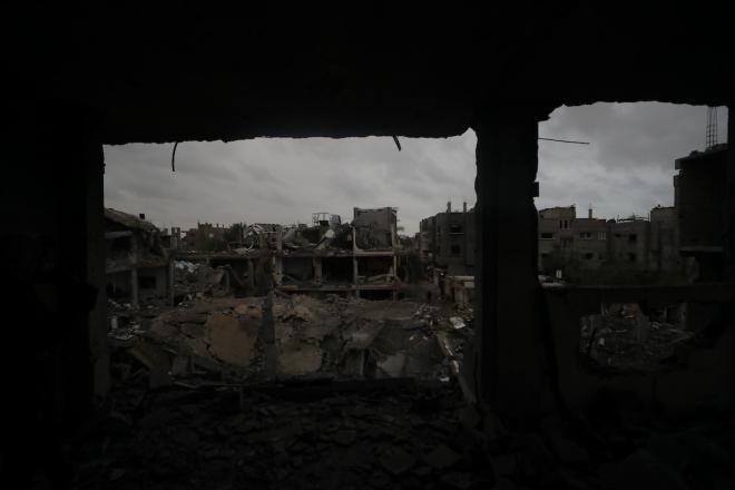 يبحث فلسطينيون عن ممتلكاتهم بين الأنقاض بعد أن دمرت غارات جوية إسرائيلية مبنى في مخيم البريج للاجئين وسط قطاع غزة. دمر الهجوم المبنى بالكامل وألحق أضرارًا بالمنشآت المحيطة به، 9 يناير/كانون الثاني 2026. صورة: معز صالحي