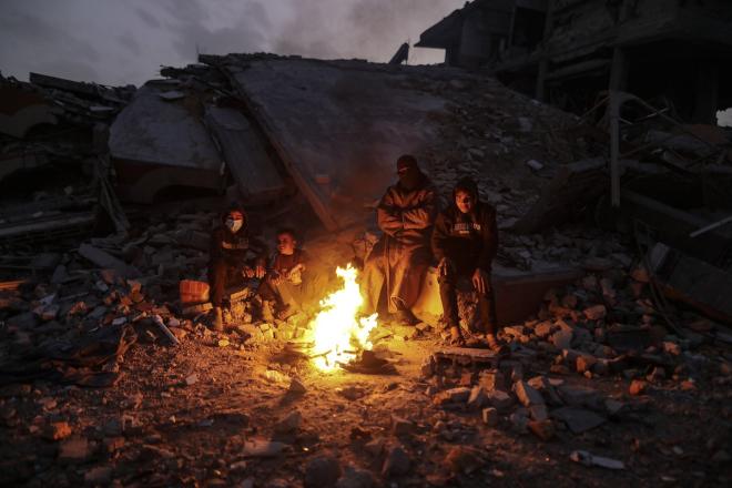 أشعلت عائلات تعيش في خيام مؤقتة وسط الأنقاض نيرانًا للتدفئة في جباليا، شمال قطاع غزة، في 12 يناير/كانون الثاني 2026. ويكافح الفلسطينيون الذين دُمرت منازلهم في هجمات إسرائيلية من أجل البقاء في ظل ظروف شتوية قاسية وبرد قارس. صورة: عمر أشتوي
