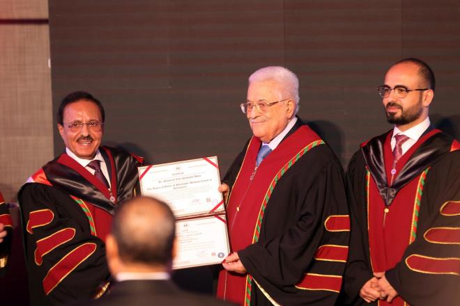 وشكر أبومازن الجامعة العربية الامريكية على قرارها منحه شهادة الدكتوراه الفخرية في العلوم الإنسانية، والتي أعتبرها وساماً عزيزاً نضعه سوياً على صدر شعبنا الفلسطيني الصابر الصامد، هذا الشعب الذي جعل فلسطين العلم والمعرفة والإبداع وجهاً آخر لفلسطين الدولة الحرة الديمقراطية.