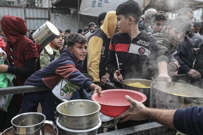 أطفال فلسطينيون ينتظرون وجبة ساخنة، توزعها إحدى المنظمات الخيرية، في ظل استمرار أزمة الغذاء بسبب محدودية المساعدات الإنسانية في مخيم النصيرات للاجئين وسط قطاع غزة، في 10 يناير/كانون الثاني 2026. صورة: معز صالحي