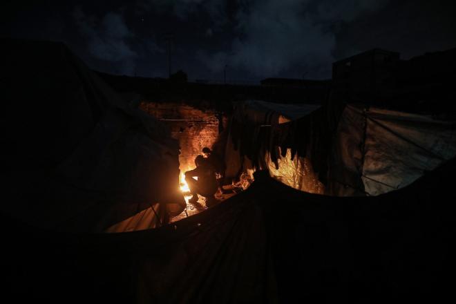 يسير فلسطينيون في أحد شوارع مدينة غزة، بينما يكافح النازحون في خيامهم لمواجهة الظلام، يتدفؤون ويطهون طعامهم بالحطب، محرومين حتى من أبسط مقومات الحياة.