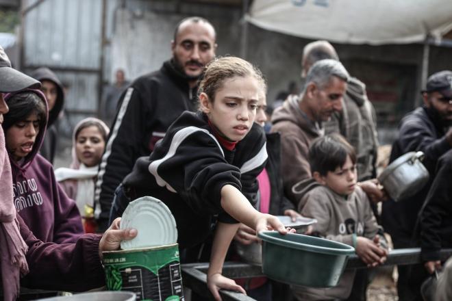 تلقى فلسطينيون، بينهم أطفال، وجبات ساخنة وزعتها إحدى الجمعيات الخيرية في مخيم النصيرات للاجئين، وسط نقص حاد في الغذاء ناجم عن الهجمات الإسرائيلية المستمرة وتدهور الأوضاع الإنسانية.
