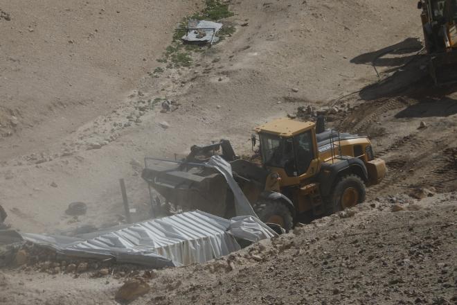 بالصور جرافات عسكرية إسرائيلية تهدم منازل تعود لسكان بدو فلسطينيين جنوب الخليل