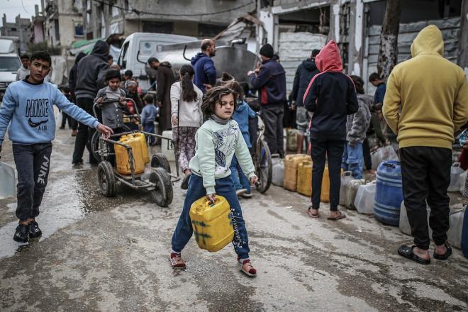 يملأ الفلسطينيون جالوناتهم بالمياه التي توزعها صهاريج المياه، وينقلونها إلى خيامهم في مخيم النصيرات، حيث تفاقمت أزمة المياه نتيجة الأضرار الجسيمة التي لحقت بالبنية التحتية جراء الهجمات الإسرائيلية.