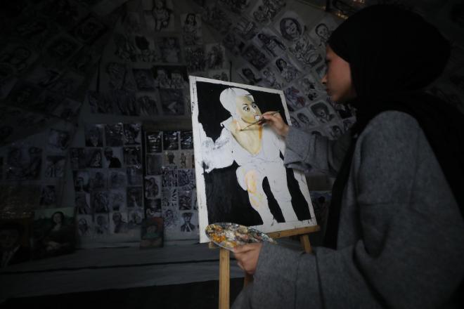 حوّلت الفلسطينية مرح خالد الزعانين، البالغة من العمر( 18 عامًا)، خيمة نزوحها في مدينة غزة إلى معرض فني.