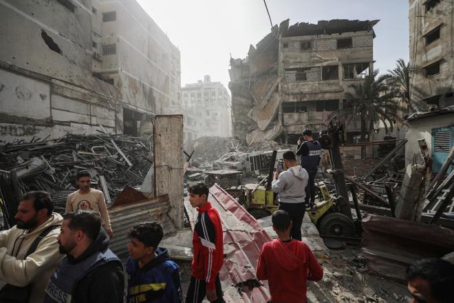 يتفقد فلسطينيون مبنىً متضرراً ومدمراً إلى حد كبير بعد استهدافه من قبل الجيش الإسرائيلي في حي النصر بمدينة غزة، في 31 يناير/كانون الثاني 2026. (صورة: عمر أشتوي)