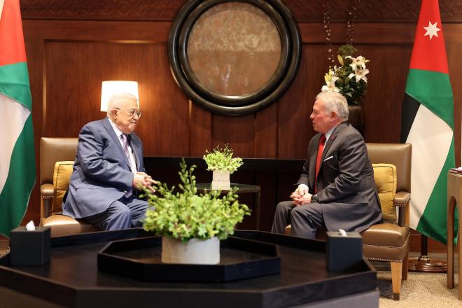 وشدد الملك، خلال اللقاء الذي عقده مع الرئيس الفلسطيني في قصر الحسينية بالعاصمة عمان لبحث مجمل التطورات في الأراضي الفلسطينية، على الرفض التام لأية قرارات من شأنها انتهاك الحقوق العادلة والمشروعة للأشقاء الفلسطينيين وقيام دولتهم المستقلة على أساس حل الدولتين.