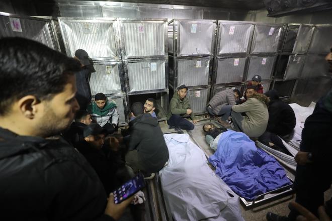 ودّع فلسطينيون جثامين أربعة مواطنين في مستشفى الشفاء بمدينة غزة، سقطوا في غارة إسرائيلية ليلة أمس في جباليا، شمال قطاع غزة. ١٥ فبراير/شباط ٢٠٢٦. صورة: عمر أشتوي