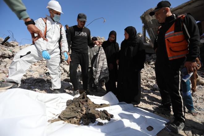 تحاول فرق الدفاع المدني الفلسطيني، بالتنسيق مع اللجنة الدولية للصليب الأحمر، انتشال جثث عائلتي عيادة وغنيم من تحت أنقاض منزل عائلة غباين، التي نزحوا إليها.