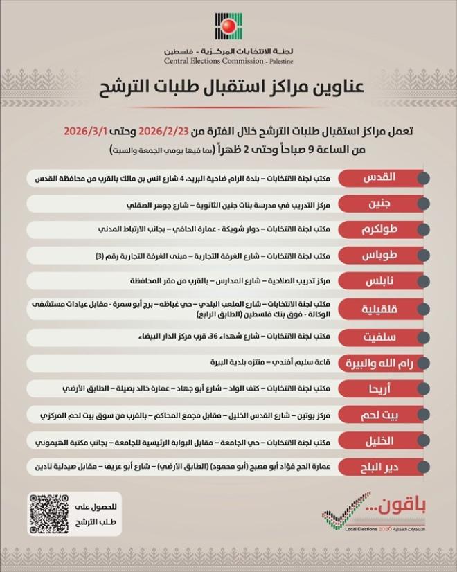 أعلنت لجنة الانتخابات المركزية الفلسطينية يوم الاثنين 23 فبراير/شباط 2026 فتح مراكز استقبال طلبات الترشح للانتخابات المحلية 2026، اعتبارا من اليوم ولغاية الأول من آذار المقبل، وذلك في 12 موقعا موزعة على جميع مدن الضفة الغربية ومدينة دير البلح.