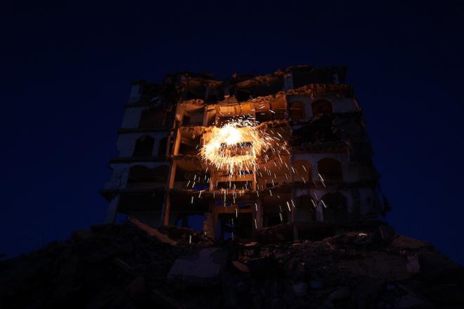 فلسطينيون يُشعلون شرارات من الصوف الفولاذي ( الليف السلكي) خلال شهر رمضان المبارك، وسط أنقاض المباني السكنية التي دُمّرت خلال العدوان الإسرائيلي الذي استمر عامين، في مدينة غزة، 23 فبراير/شباط 2026. صورة: عمر أشتوي
