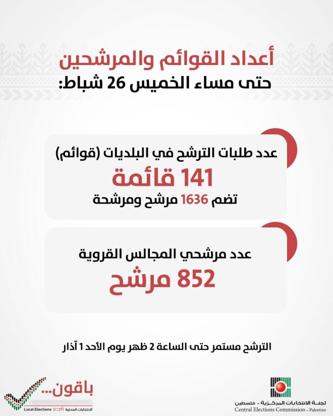 أعلنت لجنة الانتخابات المركزية الفلسطينية ، أنه حتى مساء الخميس 26 فبراير/شباط 2026 بلغ العدد الإجمالي لطلبات الترشح المستلمة في البلديات 141 قائمة انتخابية تضم 1636 مرشحاً ومرشحة، إضافة إلى 852 مرشحاً ومرشحة للمجالس القروية.