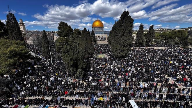 أدى 100 ألف مصلٍ، صلاة الجمعة الثانية من شهر رمضان، في المسجد الأقصى المبارك، رغم تقييدات وإجراءات الاحتلال الإسرائيلي المشددة.