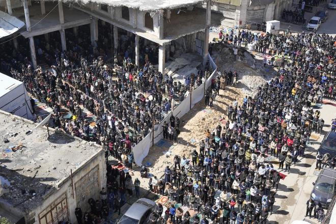 يؤدي الفلسطينيون صلاة الجمعة الثانية من شهر رمضان وسط أنقاض مسجد الكنز، الذي دُمر في هجمات إسرائيلية خلال الحرب، في مدينة غزة، 27 فبراير/شباط 2026. صورة: عمر أشتوي
