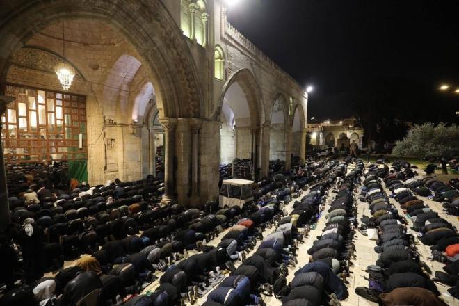 وفي ساعات المساء، أدى نحو 70 ألف مصل صلاتي العشاء والتراويح في الأقصى، في ظل انتشار مكثف للقوات الإسرائيلية التي نصبت سواتر حديدية على المداخل الرئيسية.