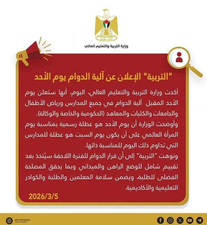 أكدت وزارة التربية والتعليم العالي الفلسطينية أنها ستعلن يوم الأحد المقبل عن آلية الدوام في جميع المدارس ورياض الأطفال والجامعات والكليات والمعاهد (الحكومية والخاصة والوكالة).