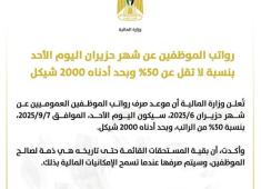 وزارة المالية: صرف رواتب موظفي القطاع العام عن شهر حزيران بنسبة 50% وبحد أدنى 2000 شيكل