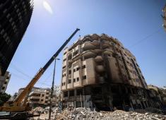 عمال يقومون بإزالة مبنى دمرته الغارات الجوية في غزة
