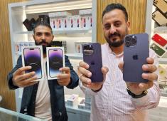 تاجر فلسطيني يستعرض هاتف آيفون 14 برو ماكس داخل محله بعد وصوله إلى قطاع غزة في مدينة خانيونس